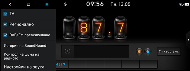Можете да регулирате опциите за контрол на радио шума. Натиснете [] > Контрол на шума на радиото в режим DAB (ако е налично)/FM. За повече подробности вижте частта „Звук“.
