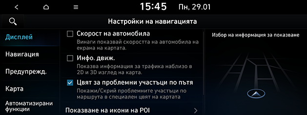 Показване на икони на POI: Задава дали да се визуализират близките точки на интерес на картата.