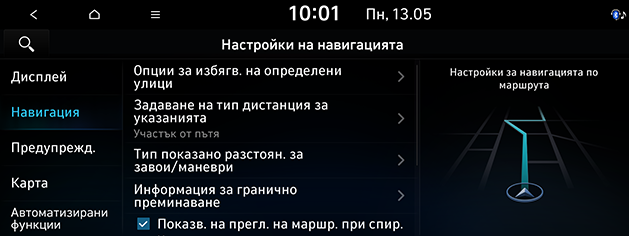 Тип показано разстоян. за завои/маневри: Задава опцията за насочване въз основа на местоположението.