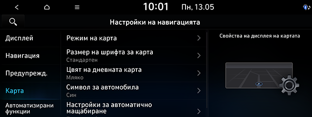 Върнете се на картата: Задава времето, след което автомобилът да се връща към картата.