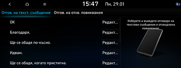 Можете да изберете желаното съобщение в Отгов. на текст. съобщение или Отгов. на отхв. повиквания.
