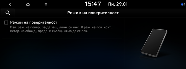Можете да зададете режима на поверителност, за да защитавате личните си данни. Контактите, хронологията на обажданията, любимите контакти и съобщенията не се визуализират, когато е активиран режимът на поверителност.