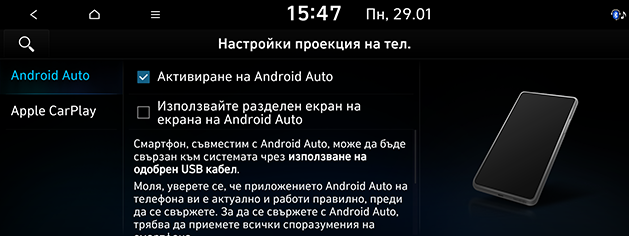 Активиране на Android Auto/Активиране на Apple CarPlay: Активира проекцията на телефона. Можете да контролирате проекцията на телефона чрез тази система.