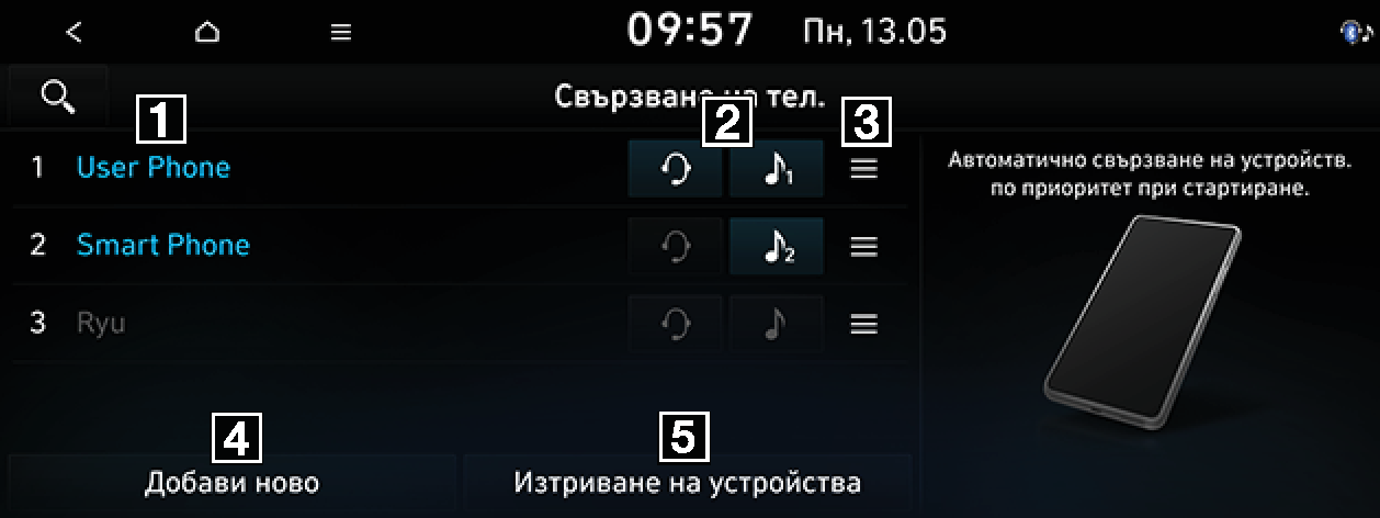 Визуализира списъка със сдвоените Bluetooth устройства. Когато избирате от списъка, устройството е свързано или изключено.