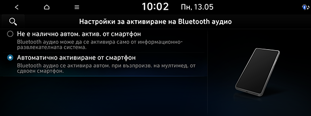 Можете да настроите режима Bluetooth аудио да се активира автоматично, когато свързаният телефон възпроизвежда аудио. Дори когато другият режим е активиран или всички медийни режими са изключени, ако възпроизвеждате Bluetooth аудио на телефона си, медийният режим автоматично се превключва на Bluetooth аудио режим, така че да можете да контролирате възпроизвеждането на телефона. Моля, проверете дали телефонът ви е сдвоен и свързан към информационно-развлекателната система преди настройване.