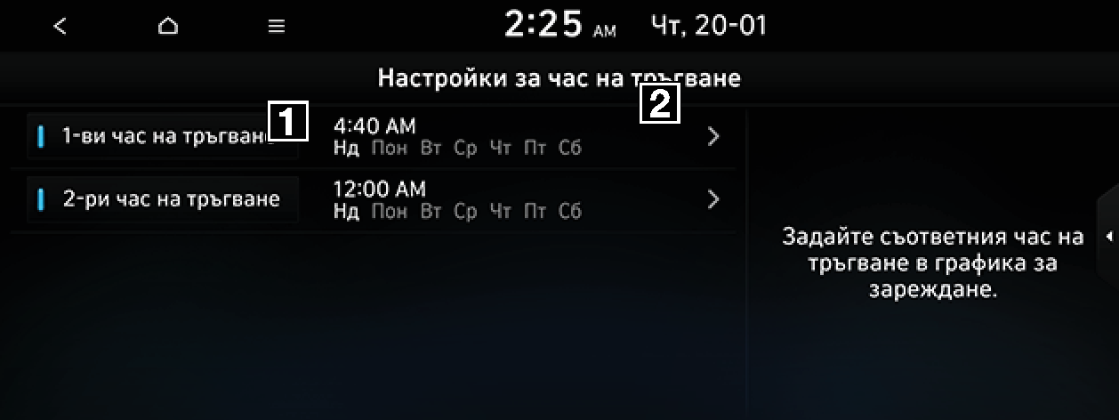 Натиснете Plug-in хибрид (PHEV) > Управление на зарежд. > Настройки за зареждане > Следващо отпътуване.