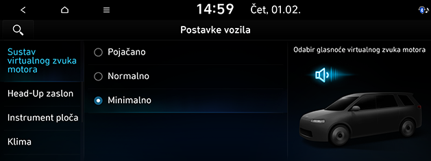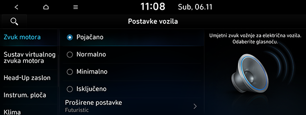 Odaberite željene stavke. Način oglašavanja zvuka motora možete postaviti na Pojačano, Normalno, Minimalno ili Isključeno.