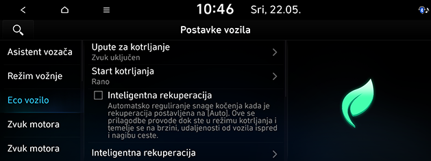 Start kotrljanja: Predlaže vam kada da započnete rad u praznom hodu (pustite gas) radi uštede goriva. Možete odabrati opcije Kasno, Normalno ili Rano.