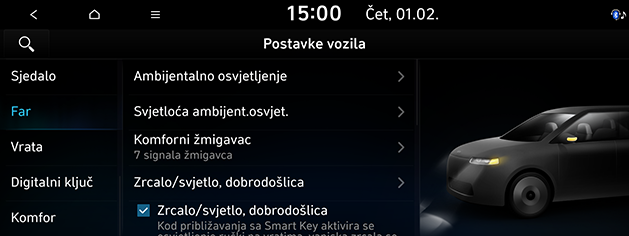 Komforni žmigavac: Odabire koliko će puta pokazivač smjera treptati kad se ručica pokazivača malo pomakne. Možete odabrati opcije 7 signala žmigavca, 5 signala žmigavca, 3 signala žmigavca ili Isključeno.