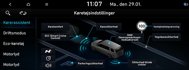 Kørekomfort: Indstiller egenskaberne for førerassistentsystemet. Vælg de emner, du vil opsætte.