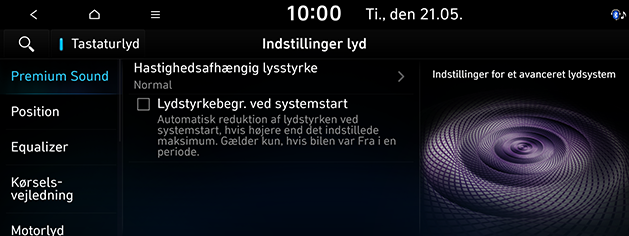 Motorlyd (hvis bilen har udstyret): Indstiller det aktive lyddesign. Du kan vælge Forbedret, Normal, Minimeret eller Fra.