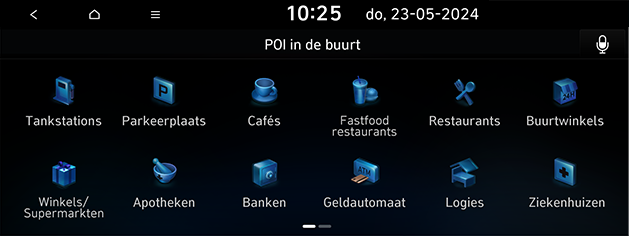 Bestemm.: Zoekt naar POI’s in de buurt van de huidige bestemming. Alleen beschikbaar wanneer de bestemming is ingesteld.