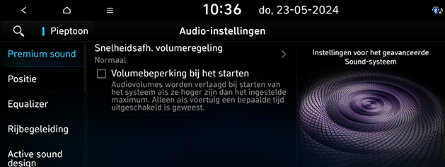 Premium sound: Stelt de optie premium geluid in die door de externe luidspreker aangeboden wordt. De subopties kunnen variëren afhankelijk van de fabrikant of het model van de uitgeruste externe luidspreker.