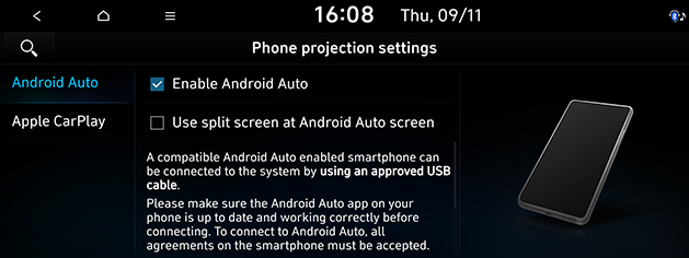 Enable Android Auto/Enable Apple CarPlay: Enables the phone projection. You can control the phone projection through this system.