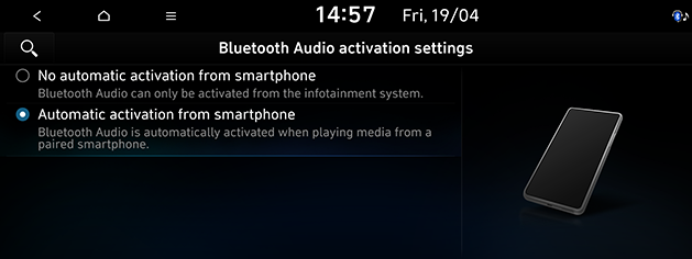 You can set Bluetooth audio mode to automatically activated when the connected phone plays audio. Even when the other mode is activated or all media mode is turned off, if you play Bluetooth audio on your phone, the media mode is switched to Bluetooth audio mode automatically so that you can control the playback on the phone. Please check that your phone is paired and connected to the infotainment system before setting.