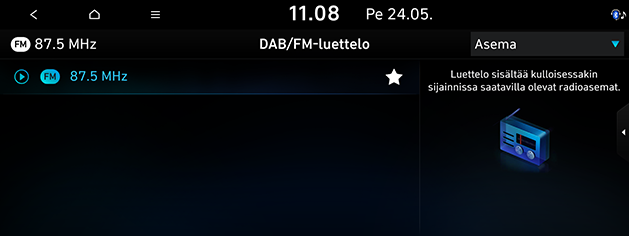 Paina Asema tai Ohjelman tyyppi DAB(jos varusteena)/FM-tilassa järjestelläksesi luettelon asema- tai ohjelmatyyppijärjestykseen.