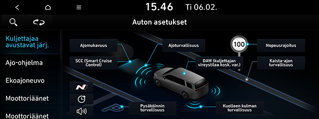 Ajoturvallisuus (jos varusteena): Säätää ajoturvallisuusjärjestelmän ominaisuuksia.