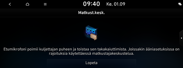 Etumikrofoni tallentaa kuljettajan puheen ja toistaa sen takakaiuttimien kautta. Paina Matkust.kesk. aloitusnäytöllä. Sammuttaaksesi, paina Lopeta.