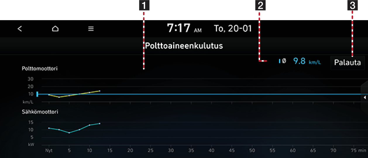 Näyttää polttoaineen kulutustiedot. (Kaavio päivitetään aina 2 minuutin ja 30 sekunnin välein.)