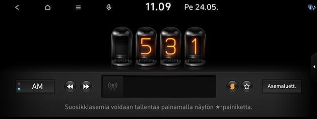 2. Paina DAB/FM tai FM vaihtaaksesi taajuusalueen AM-radioon, jos taajuusalue on asetettu DAB(jos varusteena)/FM-radioon. Viimeksi kuuntelemasi asema näytetään.