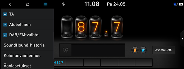 Paina AM vaihtaaksesi taajuusalueen DAB(jos varusteena)/FM-radioon, jos taajuusalue on asetettu AM-radioon. Viimeksi kuuntelemasi asema näytetään.