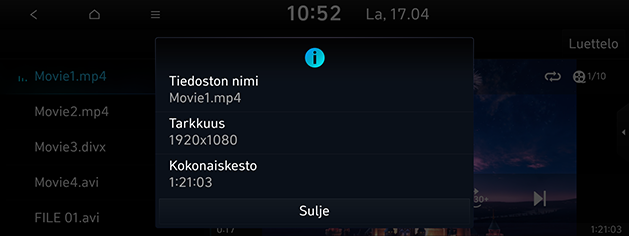 Tämä ominaisuus näyttää tiedoston nimen, resoluution ja soittoajan tiedot.