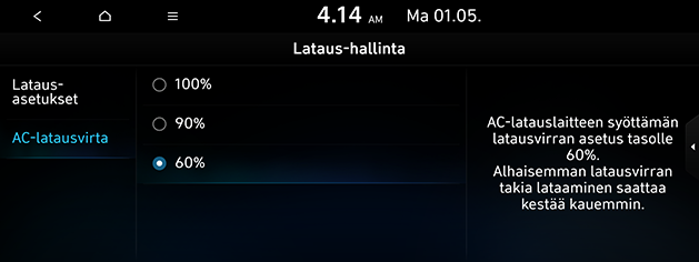 Voit asettaa vaihtovirtalaturin syöttämän virran arvoksi 60 %, 90 % tai 100 %.