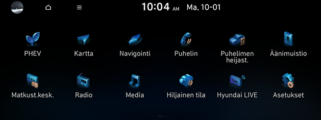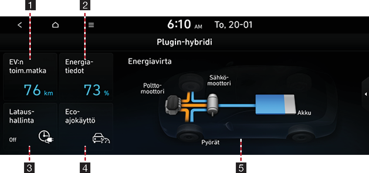 Plug-in-hybridivalikko koostuu viidestä osiosta: EV:n toim.matka, Energia-tiedot, Lataus-hallinta, Eco-ajokäyttö, Energiavirta.