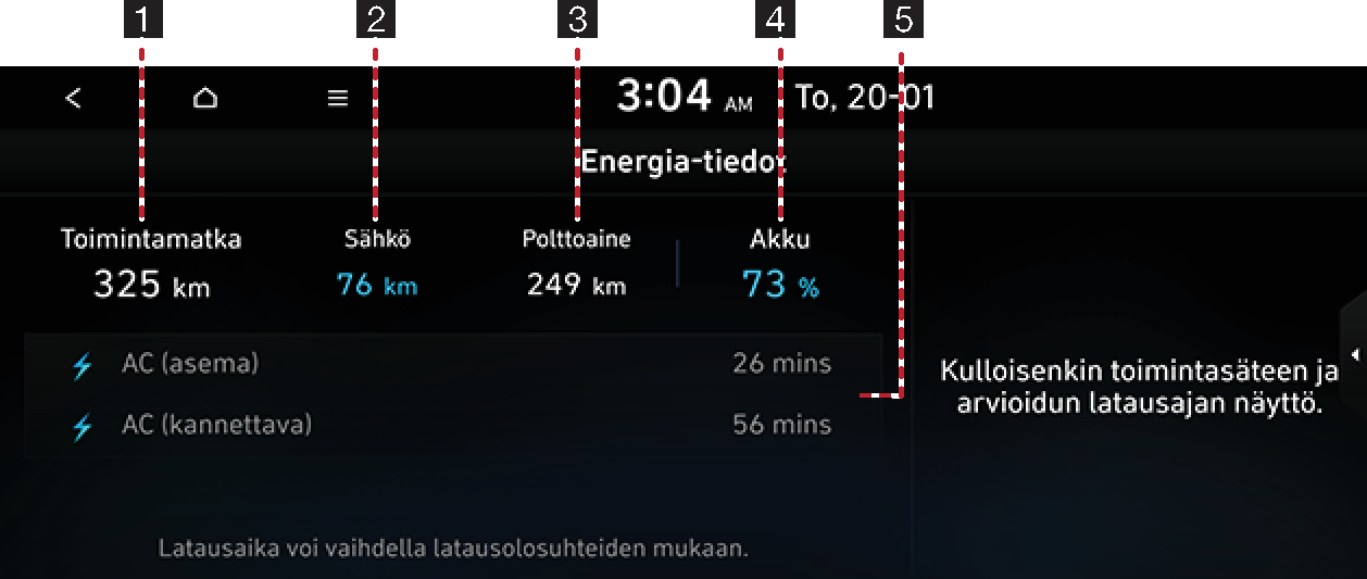 Näyttää odotetun latausajan latausjohdon ollessa kytkettynä.