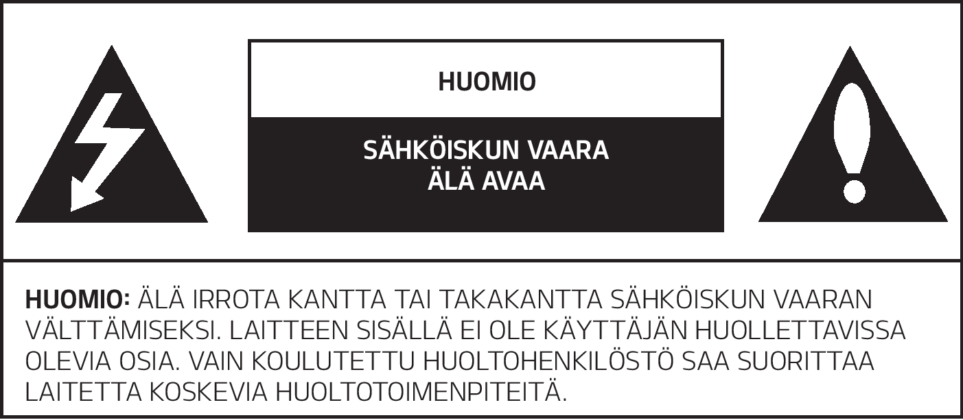 Välttääksesi sähköiskun riskin, älä poista tämän tuotteen takakantta. Sisällä ei ole käyttäjän vaihdettavia osia. Anna huoltotyöt aina valtuutetun huoltoteknikon tehtäväksi.