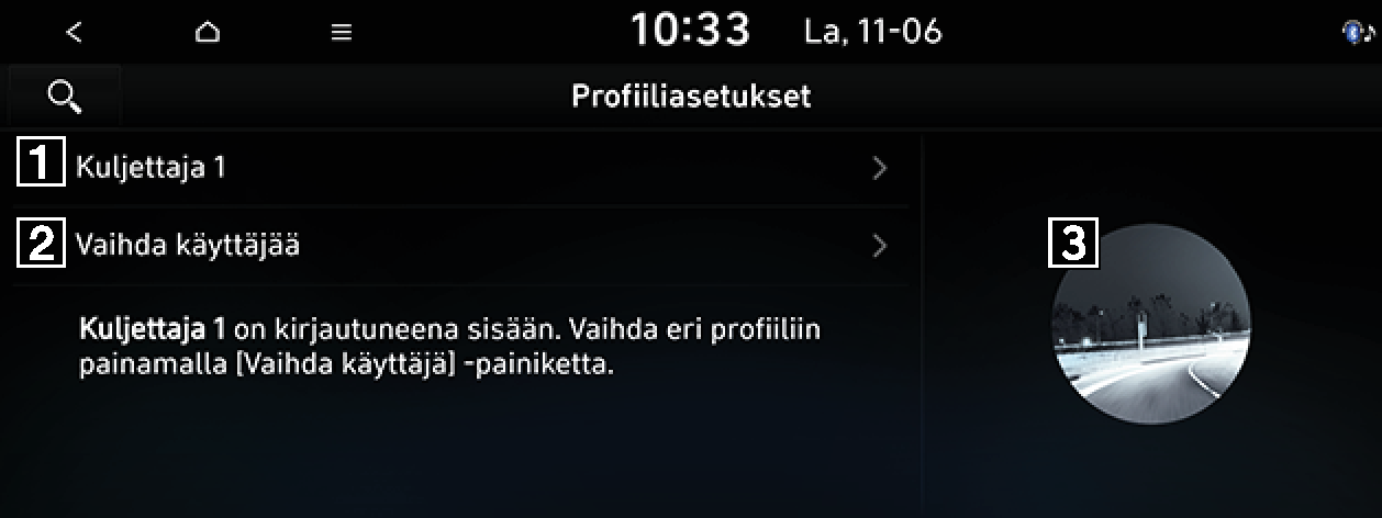 Näyttää järjestelmässä olevan profiilin nimen. Painamalla itse profiilin nimeä voit muuttaa profiiliin liittyviä asetuksia tai nollata ne.
