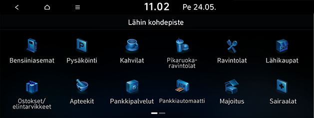 Määränpää: etsii nykyisen määränpään lähellä olevia Hyundai-palveluja. Käytettävissä vain, kun määränpää on asetettu.