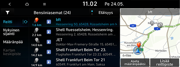 Määränpää: etsii tankkausasemia valitun määränpään läheltä.