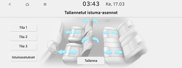 Paina Istuinasetukset siirtyäksesi istuinasetusnäyttöön.