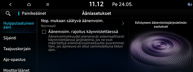Äänenvoim. rajoitus käynnistettäessä: Madaltaa äänenvoimakkuuksia automaattisesti, kun järjestelmää käynnistetään.