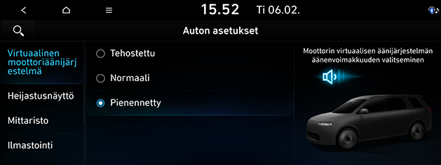 Paina SETUP > Auto > Virtuaalinen moottoriäänijärjestelmä.