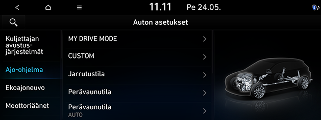 MY DRIVE MODE: Asettaa kustomoidun ajotilan perustuen käyttäjän valitsemiin järjestelmäasetuksiin, jotka vaikuttavat ajokokemukseen.