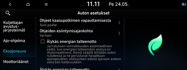 Valitse SETUP > Auto > Ekoajoneuvo.