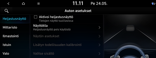 Voit muuttaa tuulilasinäytön asetuksia.