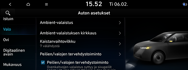 Autom. lämmityksen ohjaus: Ohjauspyörän tai valitun istuimen lämmityslämpötila määritetään automaattisesti. Valitse haluamasi asetukset.