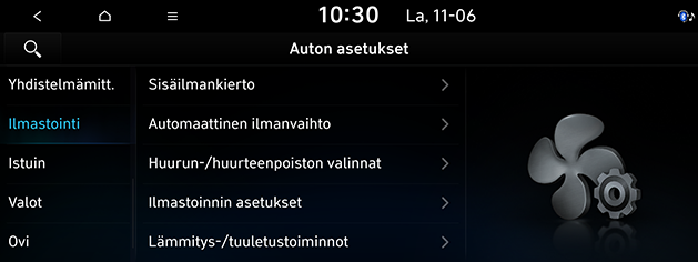 Ilmastoinnin asetukset: Määrittää ilmastoinnin asetukset.