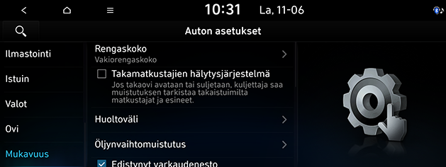Tämä valikko näyttää ajoneuvon asetukset.