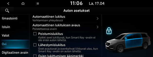 Automaattinen lukituksen avaus: Määrittää ehdot, joilla ovien lukitus avataan automaattisesti. Voit valita Poistettaessa avain, Valittaessa P-asento tai Pois käytöstä tai Auton sytytysvirta katkaistu.
