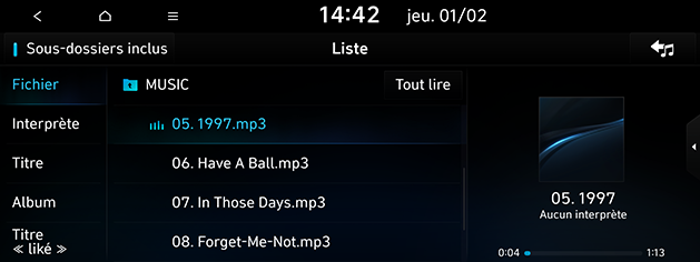 Vous pouvez lire le fichier de votre choix en le cherchant dans la liste de fichiers dans le menu USB.