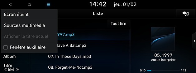 ] > Titres de cet interprète ou sur Titres de cet album pour vous déplacer vers l'écran du menu de liste. -