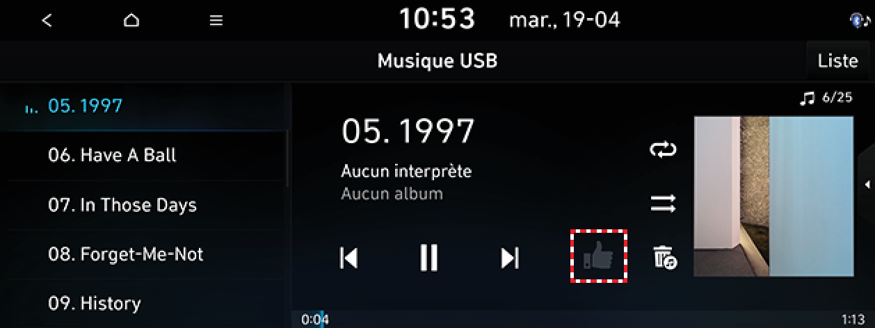 Appuyez sur Liste > Titre « liké ». Vous pouvez consulter les titres que vous avez ajoutés en tant que Favoris.