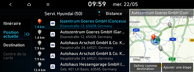 Position actuelle : recherche des services Hyundai près de la position actuelle du véhicule.