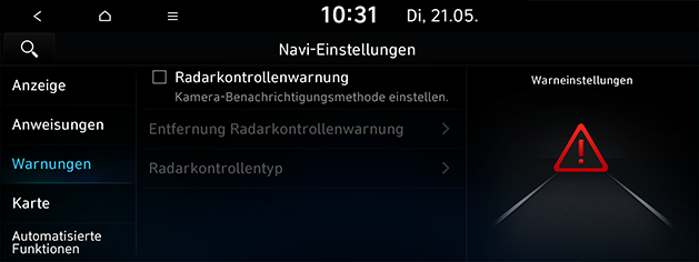 Einstellungen Radarkontrollenwarnung: Einstellungen zu Kamera-Warnung ändern.