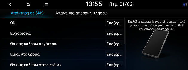 Μπορείτε να επιλέξετε το επιθυμητό μήνυμα στο Απάντηση σε SMS ή Απάντ. για απορριφ. κλήσεις.