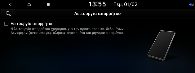 Μπορείτε να ορίσετε τη λειτουργία απορρήτου για να προστατεύετε τα προσωπικά δεδομένα σας. Οι επαφές, το ιστορικό κλήσεων, τα αγαπημένα και τα μηνύματα δεν εμφανίζονται όταν έχει ενεργοποιηθεί η λειτουργία απορρήτου.